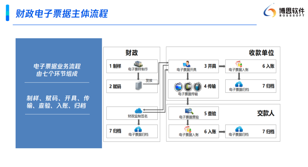 一般来说,财政电子票据业务流程由七个环节组成,分别是制样、赋码、开具、传 输、查验、入账、归档。