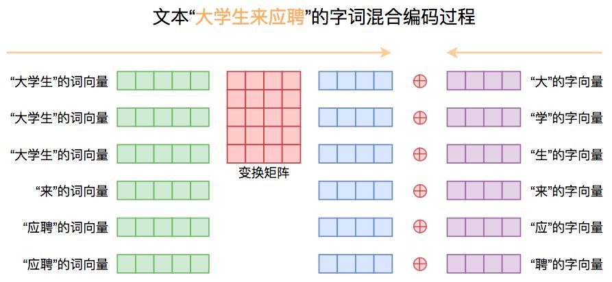 首先,我们输入以字为单位的文本序列,经过一个字 Embedding 层后得到字向量序列;然后将文本分词,通过一个预训练好的 Word2Vec 模型来提取对应的词向量,为了得到跟字向量对齐的词向量序列,我们可以将每个词的词向量重复“词的字数”那么多次;得到对齐的词向量序列后,我们将词向量序列经过一个矩阵变换到跟字向量一样的维度,并将两者。整个过程如下图:
