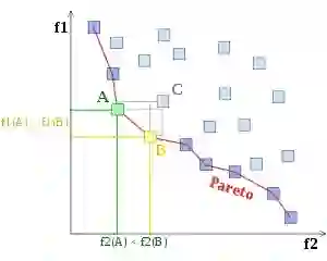 帕累托最优(Pareto optimality)是一种不能再改进的状态,不可能再改善某些个体或偏好准则而不使任何其他个体或准则受损。如果一种状态存在帕累托最优的改进,那么它被称作受帕累托支配的。一种状态如果是不受帕累托支配的,那么它被称作帕累托最优的或帕累托有效的,在优化问题中可以看作是最优点。这样的最优点组成的集合被称为帕累托边界。从下图中可以看出,A 和 B 是帕累托边界上的点,其都是对于 C 的支配。