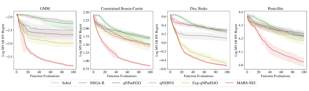 图 4 展示了随训练进程的变化,各个算法的性能表现,这里采用全局 MVaR 和设计 MVaR 的差距的 HV 的对数值作为评价指标,可以说明设计的 MVaR 能否接近全局情况。在输入噪声的干预下,非鲁棒方法显著弱于鲁棒方法,而作者的方法由于其他对比方法。图 5 展示了在真实数据集中,选择鲁棒设计和非鲁棒设计分别的收益。这里可以看出通过 MVaR 学到的设计更接近于目标值,而非鲁棒设计得到的解更可能落入非可行域中。表 1 则展示了 MARS-based 方法在运行时间上的优势。