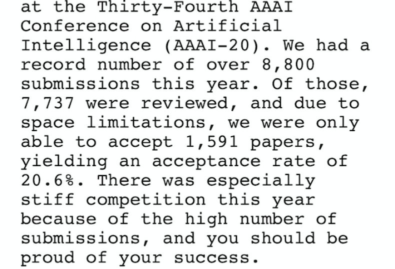 一觉醒来,朋友圈刷屏的不只有双十一,AAAI 2020 大会也终于放榜了:在今年多达 8800 篇提交论文中,最终录取的数量为 1591 篇,接收率 20.6%,竞争异常激烈。