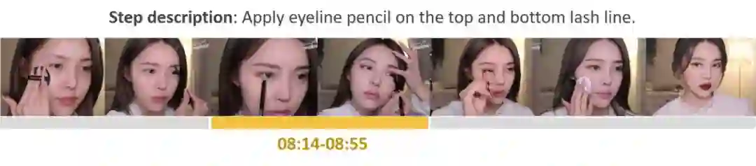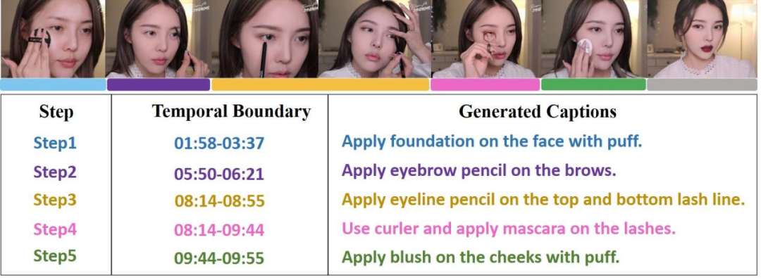 任务描述:给定一个美妆教学视频,该任务需要自动定位和描述视频中的多个化妆步骤,输出预测步骤的起始位置和对应的文本描述。本赛道同样提供美妆场景下的 2800 个教学视频,视频长度由 15 秒到 1 小时不等,平均为 9 分钟。本赛道需要理解化妆步骤之间的细微差异,具有挑战性和趣味性。
