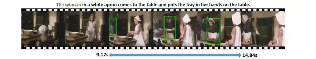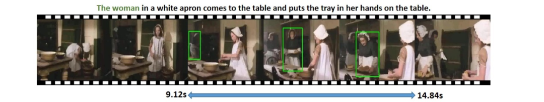 任务描述:视频中的人物时空定位任务输入为单个视频以及目标人物的描述语句,输出为目标在视频中对应描述语句的完整轨迹。本赛道提供不同电影场景的 16,000 段标注视频,每段标注视频由 20 秒左右的视频和与人相关的描述组成,输出是视频中描述所对应的开始帧和结束帧以及这段时间内描述目标的边界框。