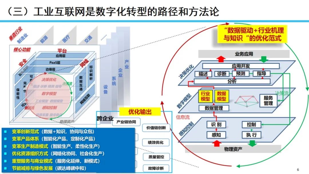 过去几年我们一起推动国家工业互联网发展,总结抽象出来一个工业互联网模型,包括物理世界和数字空间两个部分。这个新的优化范式的构建,有两条线索。一条线索是这次变革最重要的特质即数据驱动,由于物联网、互联网把各种异构数据采集起来,基于数据进行机器学习、建模分析,利用数据科学进行决策优化。但是只有这套线索是不完整的,在各个行业应用中,都需要每一个行业结合自己的知识积累。就像做汽车的会懂得怎么去做汽车,做钢铁会知道怎么去做钢铁。把这些知识和数据科学结合在一起,构成数据驱动+行业机理与知识的优化范式。把数字科学和传统物理世界的行业科学结合在一起,是工业互联网或者数字化转型中最重要的一个方法论。也是我们现在讲第四次工业革命里面最主要一条路线。