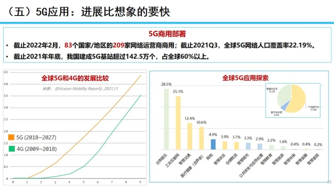 另外也提一下5G。5G在中国发展很快,但大众认知的5G和真正的5G发展其实有反差,比如在中国可能很多人都会觉得5G发展没有那么好,但实际上,5G其实比4G发展要快很多。中国进入4G是2013年,而全球4G启动2009年,我们大概晚了4年才启动,在此之前所有要素都相对完善了,所以进去就是高峰。而5G中国第一时间和美国、韩国三个国家同步部署,所以我们是引领者、引导者,意味着自己要做很多试错。下图有一些典型的全球5G应用探索,可以看到绝大部分应用都是to B的,都是广义工业互联网范畴,这一点和过去4G技术有很大不同。