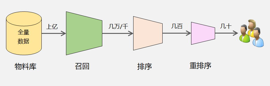 推荐系统本质上就是一个信息过滤系统,通常分为:召回、排序、重排序这3个环节,每个环节逐层过滤,最终从海量的物料库中筛选出几十个用户可能感兴趣的物品推荐给用户。
