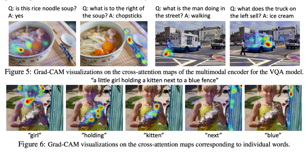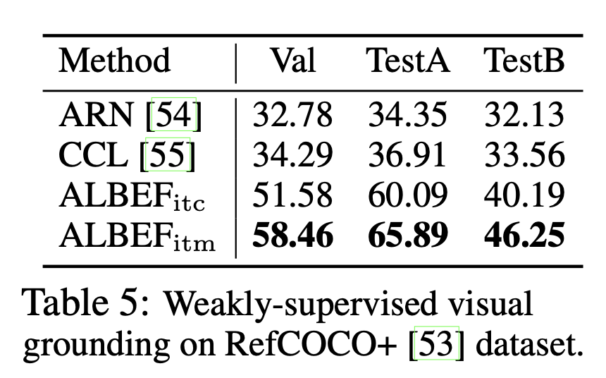 可见,先对齐再融合的思路符合多模态任务的需求,让模型能够更好的利用多模态的信息,这解释了ALBEF在诸多多模态理解任务中的出色表现,同时从Visual Grounding任务中可以看出,ALBEF提出的预训练任务确实使得模型学会了图片信息和文本信息的对应关系,这也为后续研究提供了启发。