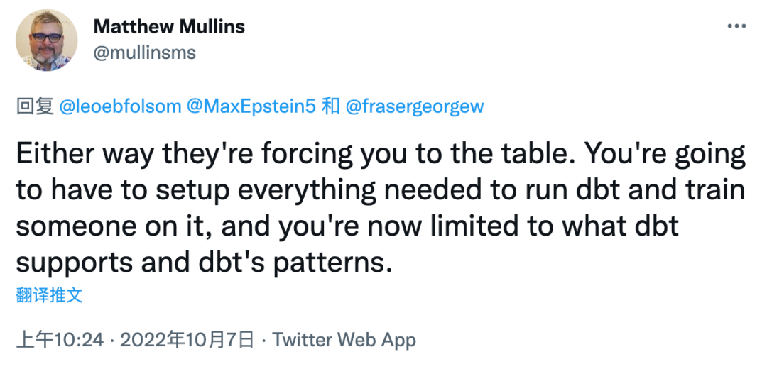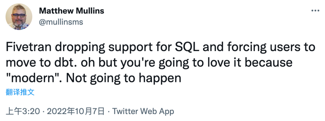 不过,近日一位 Twitter 博主、也是数据分析平台 Cogniti 的首席技术官@Matthew Mullins 突然发了一条推文,他写道,“Fivetran 放弃支持 SQL,并强迫用户转向 dbt。但你可能会因为更为“现代化”而喜欢它。”