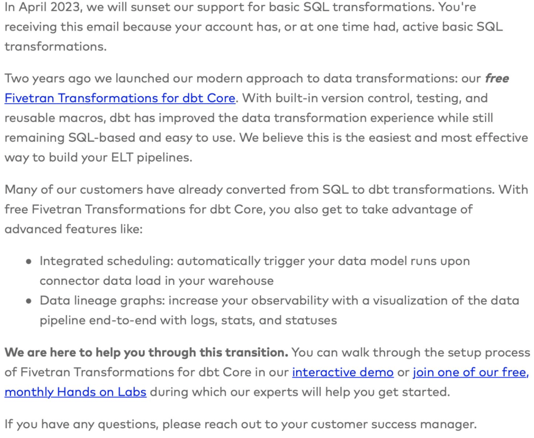在 2023 年 4 月,我们将结束对 Basic SQL Transformations 的支持。你收到这封邮件是因为你的账户当前或者曾经有活跃的 Basic SQL Transformations。