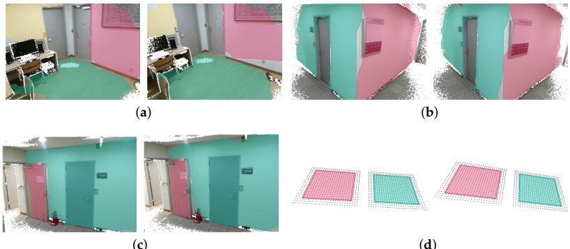 当有超过3对平面对时,能估计出6DoF参数(3平移,3旋转)。然而,当其中存在有一对平面有相同的法向量时,分别对旋转和平移产生1和2个自由度的退化。由于噪声,可将一对平面对应显示为两对虚假对应。此时提出能区分真实和虚假两对对应的算法。