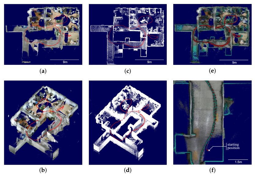 图9(a)优化的地图俯视图;(b)优化的地图鸟瞰图; (c)地面实况顶视图; (d)地面实况鸟瞰图; (e)叠加地图顶视图; (f)叠加地图特写视图。(a,b)显示使用低成本传感器系统通过所提出的方法优化的RGB-D图。(c,d)显示使用高成本传感器系统获得的基本事实。(e,f)显示优化地图与地面实况之间的叠加地图,其中绿色点云和轨迹是基本事实。为了改善深度可视化,将眼顶灯照明着色器应用于(e,f),其中地面实况的点云被随机地二次采样10%