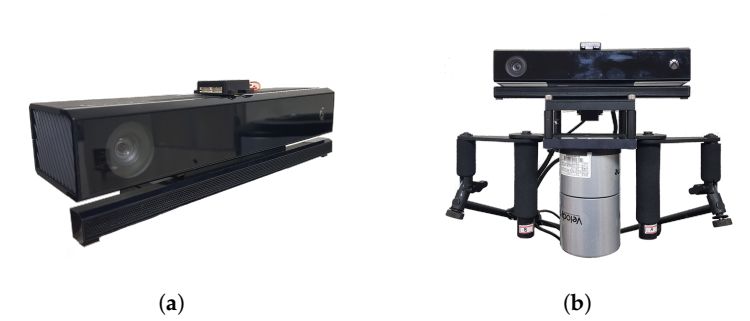 为进行性能验证,SLAM实验在两个不同的传感器系统中进行。一个(图a)是低成本的传感器系统,具有Kinect v2和廉价的IMU(CH-UM7:±4°用于动态俯仰/滚转精度,±8°用于动态偏航精度)。另一个(图4b)是高成本的传感器系统,具有Velodyne LiDAR(HDL-32E)和MicroStrieIMU(3DM-GX3-45:±2°,用于动态俯仰/滚转/偏航精度)。高成本系统的目的是提取地面真相,并配备低成本系统进行严格的验证。