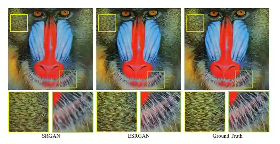 SRGAN的输出与ESRGAN的输出,与作为参考的真实图像。生成的HR图像是LR输入的四倍。 ESRGAN在锐度和细节方面优于其前身。