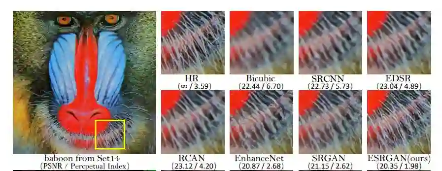 作者在PIRM-SR挑战中对他们的网络进行了测试,其中ESRGAN以最佳感知指数赢得了第一名。