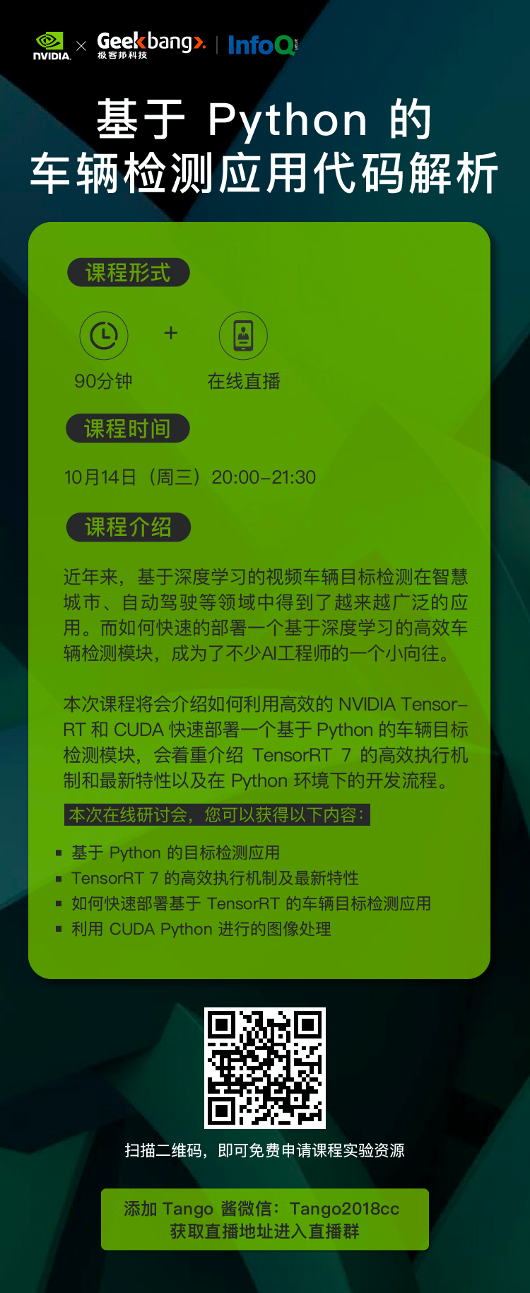 英伟达即将在 10 月 14 日晚上 8 点进行主题为“基于 Python 的车辆检测应用代码解析”的分享,教你用三十分钟搭建基于 Python、TensorRT 和 CUDA 的高效车辆检测模块,直播信息如下,赶快扫描下方的二维码或者点击【阅读原文】报名吧!