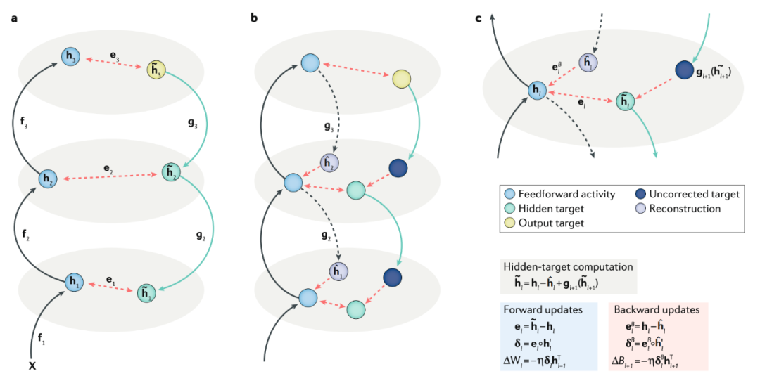 此学习过程称为差异目标传播(difference target propagation,DTP),并在图 3b 和 c 中与逐层权重更新一起显示。