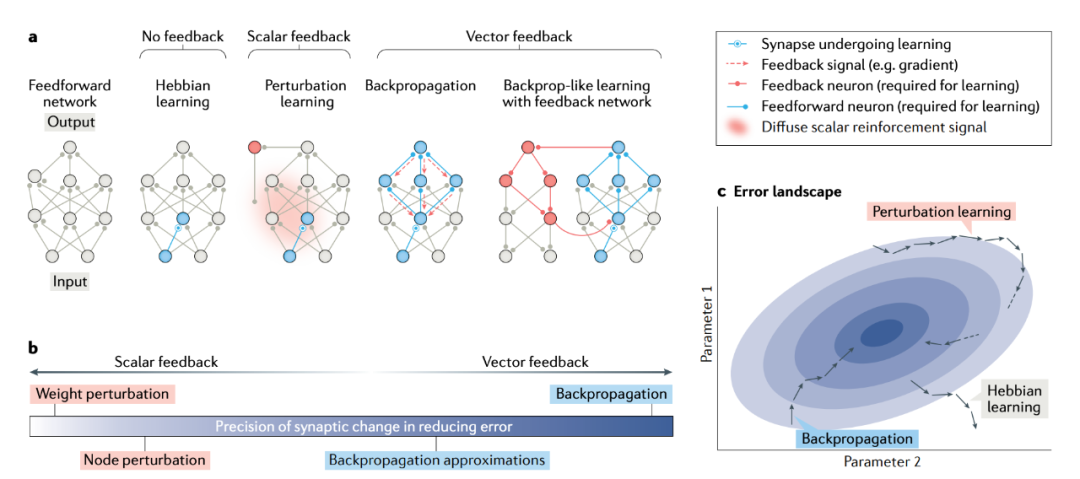 尽管如此,神经科学的最新发展和神经网络的成功激活了人们对反向传播能否帮助进一步了解皮层学习的兴趣。反向传播算法使用反向连接(feedback connection)传递误差信号,来计算突触更新,从而实现快速学习。尽管反向连接在皮层中无处不在,但我们很难观察到它们是如何传递反向传播所需误差信号的。