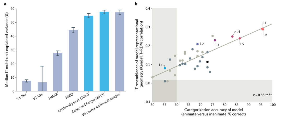 该研究表明,相比匹配灵长目动物视觉皮层腹侧流中表征的其他模型,使用反向传播训练得到的多层分类模型性能更好(参见下图 2)。