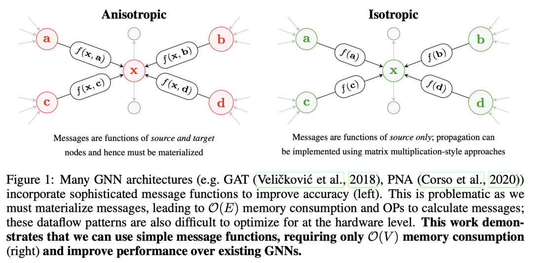 此类模型遵循 GNN 架构设计的消息传递风格(由 Petar Veličković 推广),并且可以被认为是「各向异性的」,因为它们对每条边进行了不同的处理(而普通 GCN 是「各向同性的」,因为相同的可学习权重被应用于每条边)。然而,在每层的节点和边上维护隐空间嵌入会显著增加 GNN 的推理延迟和内存需求。