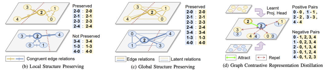 最近,Joshi 等人扩展了 LSP 研究,通过保留直接邻居之外的潜在相互作用来考虑全局拓扑结构。他们为 GNN 提出了两个新的表示蒸馏目标:(1)一种显式方法——全局结构保留,它扩展了 LSP 以考虑所有成对的相似性;(2) 一种隐式方法——图形对比表示蒸馏,它使用对比学习将学生节点嵌入与教师节点嵌入在共享表示空间中对齐。