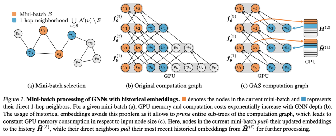 GAS 框架有两个主要组成部分:首先,第一部分是构建一个小批量节点(执行快速随机子采样)并修剪 GNN 计算图以仅保留小批量内的节点及其 1 跳邻居节点——这意味着 GAS 的尺度独立于 GNN 深度。其次,每当 GNN 聚合需要小批量节点嵌入时,GAS 就会从存储在 CPU 上的历史嵌入中检索它们。同时,当前小批量节点的历史嵌入也不断更新。