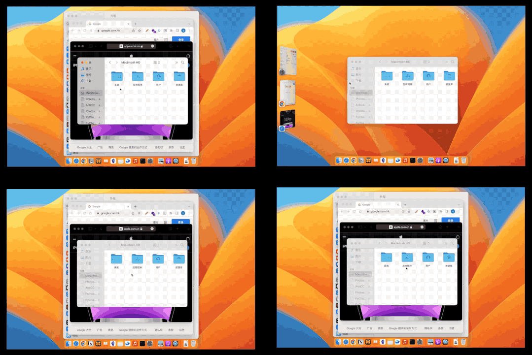 「调度中心」提供了一个鸟瞰图,其中包含您打开的所有窗口、桌面空间,以及全屏或分屏浏览模式下的所有 app,让您能轻松地在它们之间切换。 —— Apple 官网