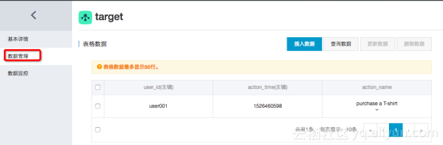 执行结果提示成功的话,则在表格存储的 target表中就可以读到如下的测试数据。
