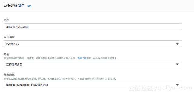 实例函数名称为:data-to-table, 运行语言选择为 Python 2.7,使用 lambda-dynamodb-execution-role的角色。