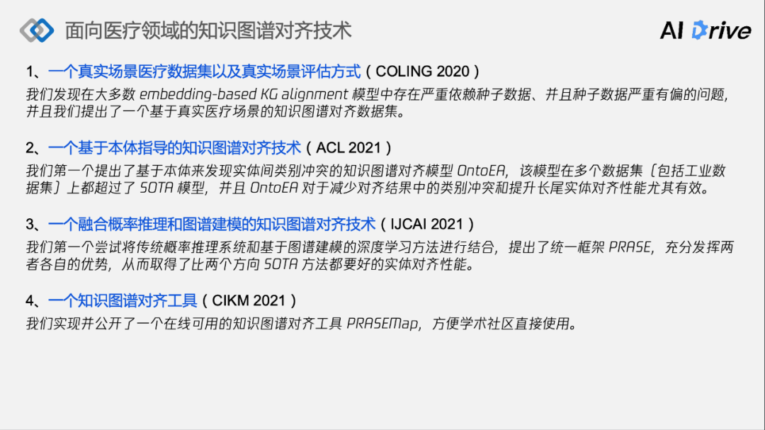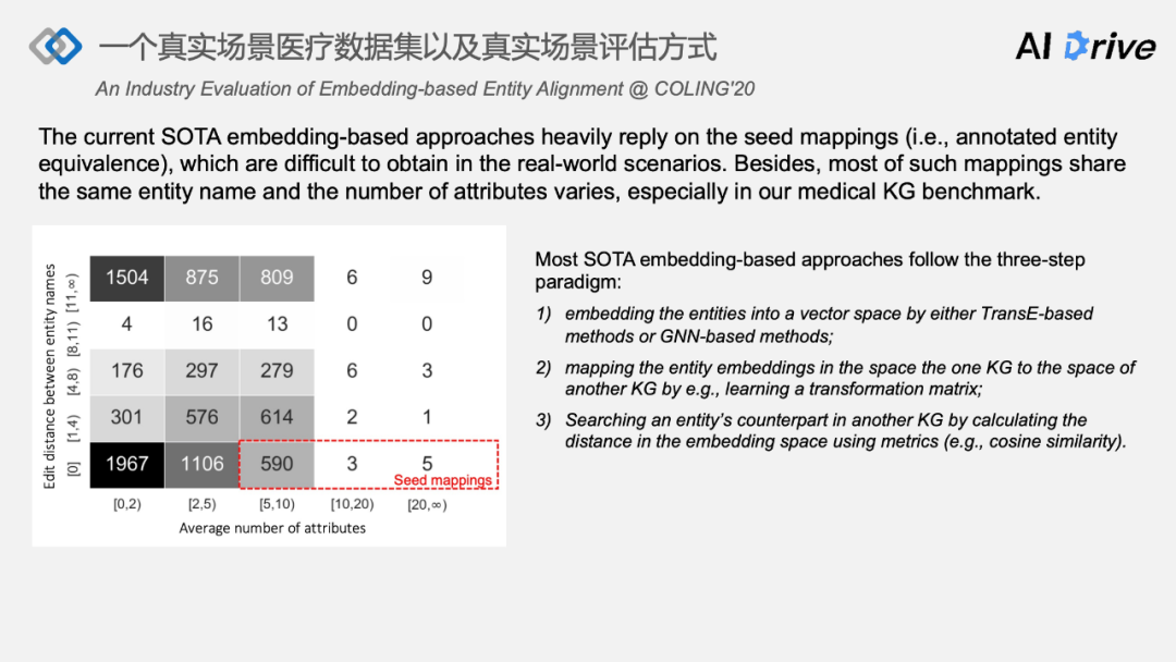 第一,发现大多数基于 embedding-based 的方法知识图谱对齐框架在实际使用中存在严重依赖种子数据、种子数据严重有偏的问题,可以提出基于真实医疗场景的知识图谱对齐数据以及真实场景的评估方式。