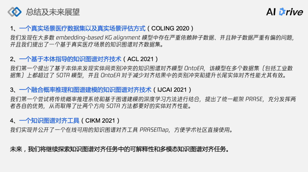 未来,我们将会继续探索知识图谱对齐当中的可解释吸引或者多模态制度对齐的任务。