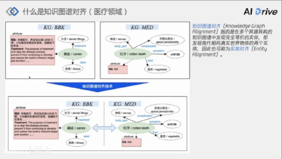 如果去校验某一节点,人工成本非常高,相比小规模的垂域突破,比如关于药物或者药物间相互作用的图谱,它们的规模更小,可以在控制成本的基础上把握知识的准确率或者知识图谱的质量,因此,可以通过图谱对齐技术将规模比较小、相对质量比较高的图谱进行融合,构建一个大规模高质量的医疗知识图谱。