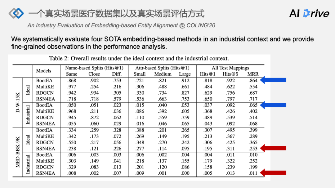 在 Name-based Splits 中分别考虑两个实体名称是完全一致的、接近或者完全不同的,同时考虑它的属性数量是较少的、中等或者较多的。具体划分要看这个数据集各自的不同情况。在数据层面上,选择两个数据集。另外,提出了 MED-BBK-9K 数据集,首先,第一个实验结果发现,如蓝色和红色箭头所示,从整体来看,当模型的训练方式由 ideal 变成 industry 时,只改变种子数据的采样方式,比如 BootEA 的 MRR 由 86.4% 掉到了 6.5%,这是非常明显的性能下降。