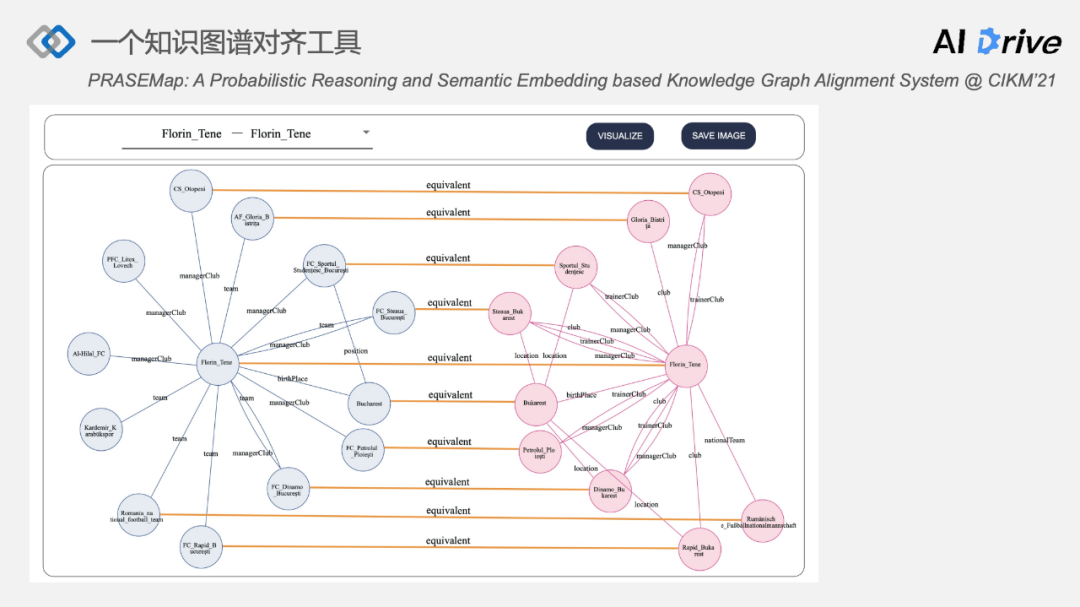 上图是关于对齐之后的知识图谱的展示效果,在知识图谱对齐中,当中心实体是对齐的,其邻居很多也是对齐的,如果知识图谱的构建不容易,这样的例子也可以完全展示出这样的效果,或者开发这样前端的框架,是为了方便大家更直观地理解知识图谱对齐之后的可解释或者深层次的关系,通过这种邻居关系信息的传导,构建起跨图谱的对齐关系。