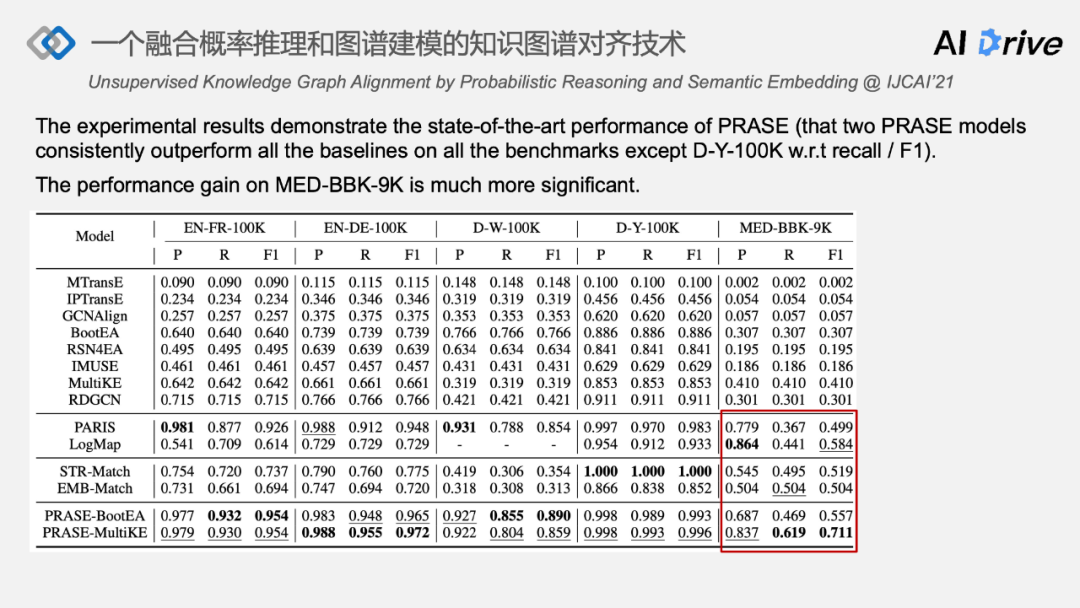 第三,尝试将传统的概率推理系统和基于图谱建模的系统的深度学习方法进行结合,提出了统一的框架 PRASE,充分发挥了两者的优势,从而取得比两个方向都要更好的知识图谱对齐性能。