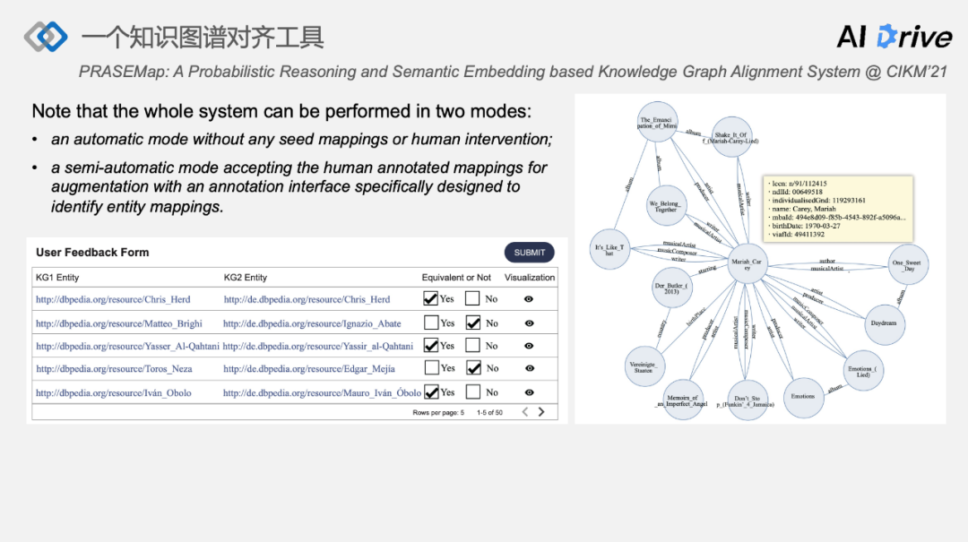 第二,引入了一个新的尝试,提出了新的观点是 PRASEMap,即可以用两种方式来进行运行,第一是全自动模式,即整个系统默认的方法,不需要任何种子数据,也不需要任何人工监督成分,直接把知识图谱进行上传,或者在系统里选定默认的知识图谱,来运行 PRASEMap 系统。