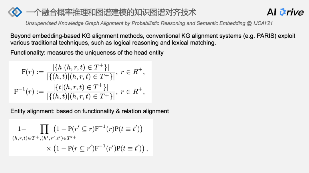 以 PARIS 系统为例,传统方法用到 logic consistency 技术或者相对 embedding 比较传统的技术 lexical matching,在语义网领域的效果证明了在很多数据集上不逊于 embedding-based 方法,比如 PARIS 的核心或者里面很重要的是基于对 functionality 的计算。functionality 最直观的理解是对于头实体的唯一指向性的描述,当 functionality 是 1 的时候,如果你的实体是确定的,有这个关系数据的尾实体也一定是确定的。如果 founder 的 functionality 是 1,对于任何一家公司的头实体来讲,只要有 founder 的关系,对应的尾实体是确定的(即创始人是唯一确定的)。它基于很多逻辑推理的工作。PARIS 在计算评估设计对齐概率时,会充分用到 functionality 的计算以及关系对齐计算。