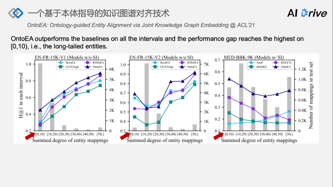 第二,我们再去检查类别冲突的 bad case 是否解决。有三个数据集,分别是 EN-FR 的 V1/V2 和工业数据集。可以看到,在最左边图示里,它表达的含义是 BootEA,所有的 bad case 当中有 42.2% 的 bad case 来自于类别冲突,但是对此 OntoEA 的 bad case 的百分比降到了 3%,在 V2 上降到 0.3%,在工业数据集上是由最低的 51.5% 降到了 34%,反过来可以印证当时加入本体信息所期待的效果,即可以减少 false positive 对齐结果,尤其是类别冲突所带来的 false positive。