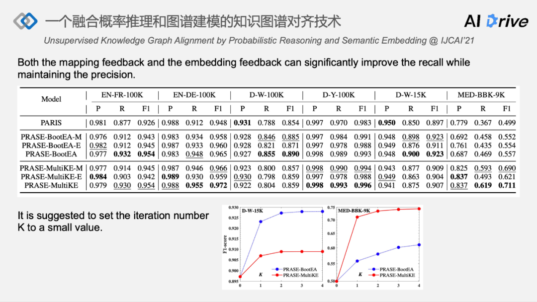 在 PRASEMap 实验中,我们引入了半自动的方法,或者引入了方便人机交互的方法,在某迭代轮次之后,允许 PRASEMap 接受人工标注的结果,来增强知识图谱对齐的效果。上图左下角的这张图是用户反馈的表格,PRASEMap 会产出当前轮次对于预测结果里低置信度的实体,这时,由人工进行标注,这两个实体究竟是等价或不是等价,通过这样标注进行提交,在下个迭代轮次里面可以优化对齐效果。