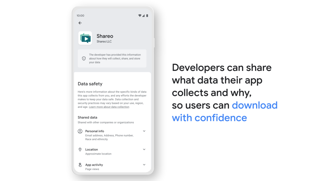 用户将在商品详情中首先看到 "数据安全" 摘要。应用简介将显示应用收集或共享的数据,并突出展示安全细节,例如: