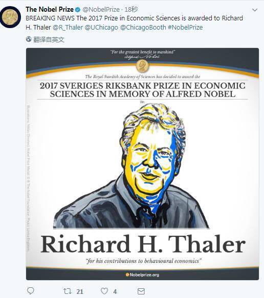 今天下午5时45分(瑞典斯德哥尔摩时间10月9日上午11时45分),2017年诺贝尔奖的最后一个悬念——经济学奖被揭晓,瑞典皇家科学院将奖项颁给了对行为经济学产生贡献和影响的美国经济学奖、芝加哥大学教授理查德·泰勒(Richard H Thaler)。