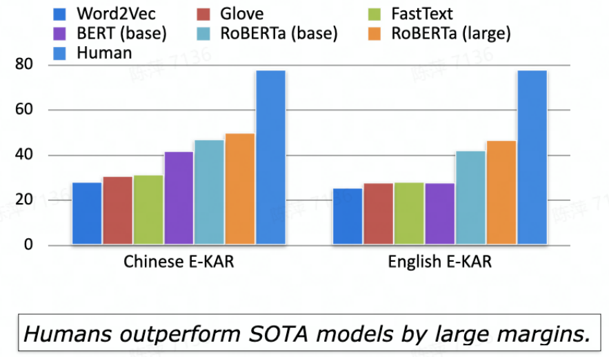 该研究首先基于词嵌入和预训练语言模型 (BERT、RoBERTa) 进行了类比推理问答任务 (QA) 的实验,结果如图 5 所示,这表明无论是静态词嵌入还是目前最先进的语言模型,要想完成 E-KAR 这种复杂和知识密集型的类比推理任务都很困难。
