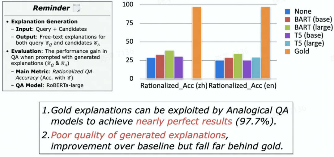 首先,用该研究事先标注好的解释去作为额外的输入,能帮助类比推理问答任务 (QA) 达到接近完美准确率。然而替换成生成的解释时,结果却差很多(图 8)。
