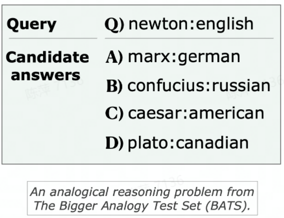 现有的类比推理数据集,多以选择题的形式出现,下图是来自 BATS 数据集 [3] 的一个例子,选项分别是 “马克思” 比“德国人”、“孔子”比 “俄罗斯人”、“凯撒” 比“美国人”和 “柏拉图” 比“加拿大人”,需要选择的是与问题:“牛顿”比 “英国人” 相同对应关系的选项。