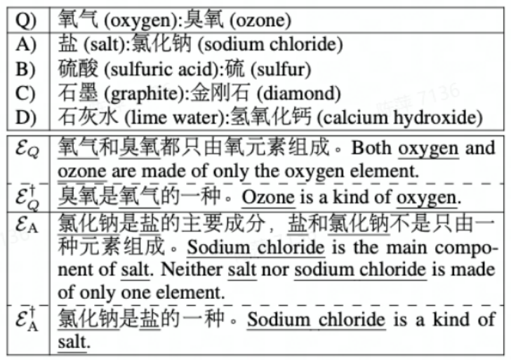 的是事先标注好的,可以看到,对于否定句,模型不知道盐和氯化钠都不是只由一种元素组成的,生成的解释偏向于 “A 是 B” 的模式。