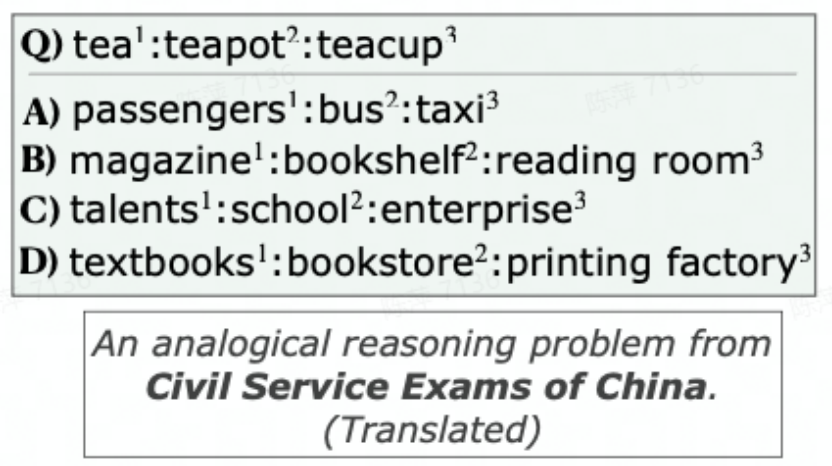 在 NLP 中,我们比较熟悉的是以多选题形式出现的词类比识别问题,然而现有的词类比数据集关注简单的二元类比关系,并且缺乏用于届时类比推理过程的标注信息。因此,解答这一类问题并不能揭示神经网络模型类比推理的内在过程,这对探究类比的内部性质来说是不利的[6]。我们亟需一类更困难的、可解释的类比推理数据集。