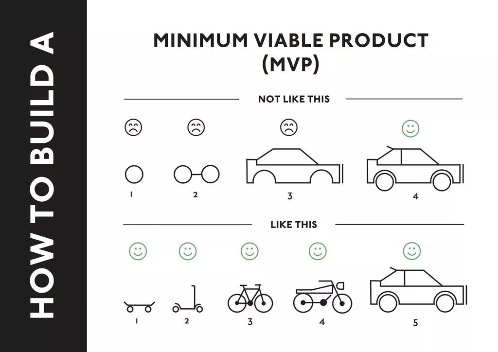 假如你的产品愿景是一种高级出行工具,比如小轿车。传统的产品设计思路是一步一步,从车轮、车轱辘、外壳、动力装置、内部装饰一个流程一个流程做起,最后得到一个完善的产品。而MVP的思路,我们可能会先做一个小滑板车或者自行车,看看用户对出行工具的认可程度。如果用户认可我们的产品概念,我们可以接下去生产更加高级、完善的摩托车、甚至小轿车。