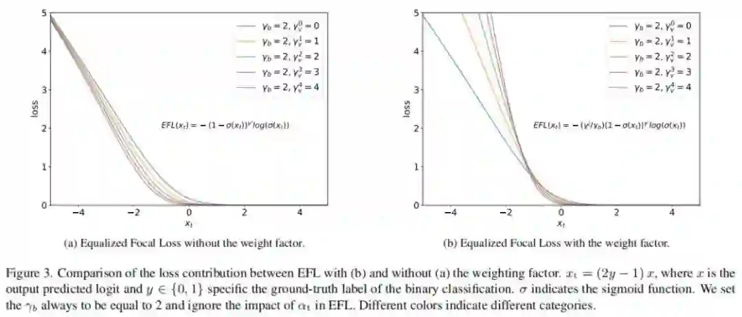 Focusing Factor和Weighting Factor构成了EFL的与类别相关的调节因子。它使分类器能够根据样本的训练状态 和对应的类别状态 动态调整样本的损失贡献。Focusing Factor和Weighting Factor在EFL中均有重 要作用。同时,在平衡数据分布中,所有 的EFL都相当于Focal Loss。这种吸引人的特性使得EFL可 以很好地应用于不同的数据分布和数据采样器之中。