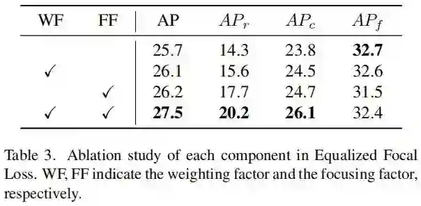 对于focusing factor,AP从25.7%提高到26.2%的AP。同时,在罕见类别上有显著提高,AP提高了3.4%,说明其在缓解严重的正负失衡问题方面的有效性。