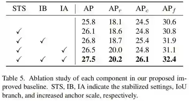 如Tab2所示,使用ResNet-50-FPN,本文提出的方法实现了总体27.5%的AP,将提出的改进Baseline提高了1.8%的AP,甚至在罕见类别上提高了5.9%。结果表明,EFL能够很好地处理稀有类的极正负失衡问题。