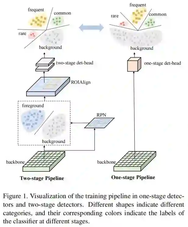 与包含区域建议网络(RPN)的两阶段方法,在将建议提供给最终的分类器之前过滤掉大多数背景样本相比,一阶段检测器直接检测规则的、密集的候选位置集上的目标。如图1所示,由于密集的预测模式,在一阶段检测器中引入了极端的前景-背景不平衡问题。结合长尾场景下的前景类别(即类别的前景样本)不平衡问题,严重损害了一阶段检测器的性能。